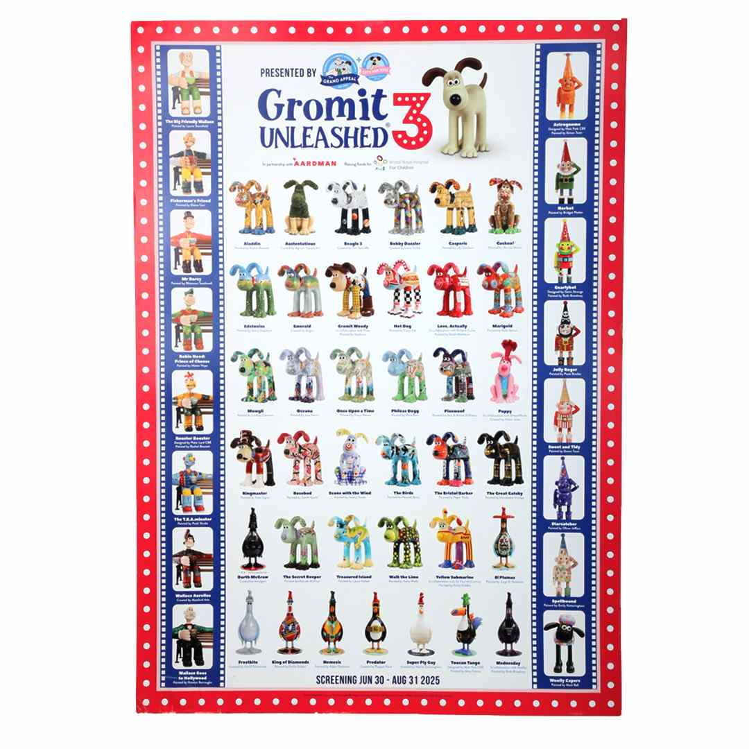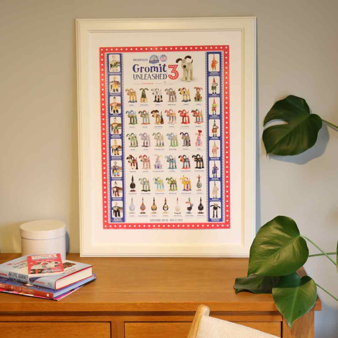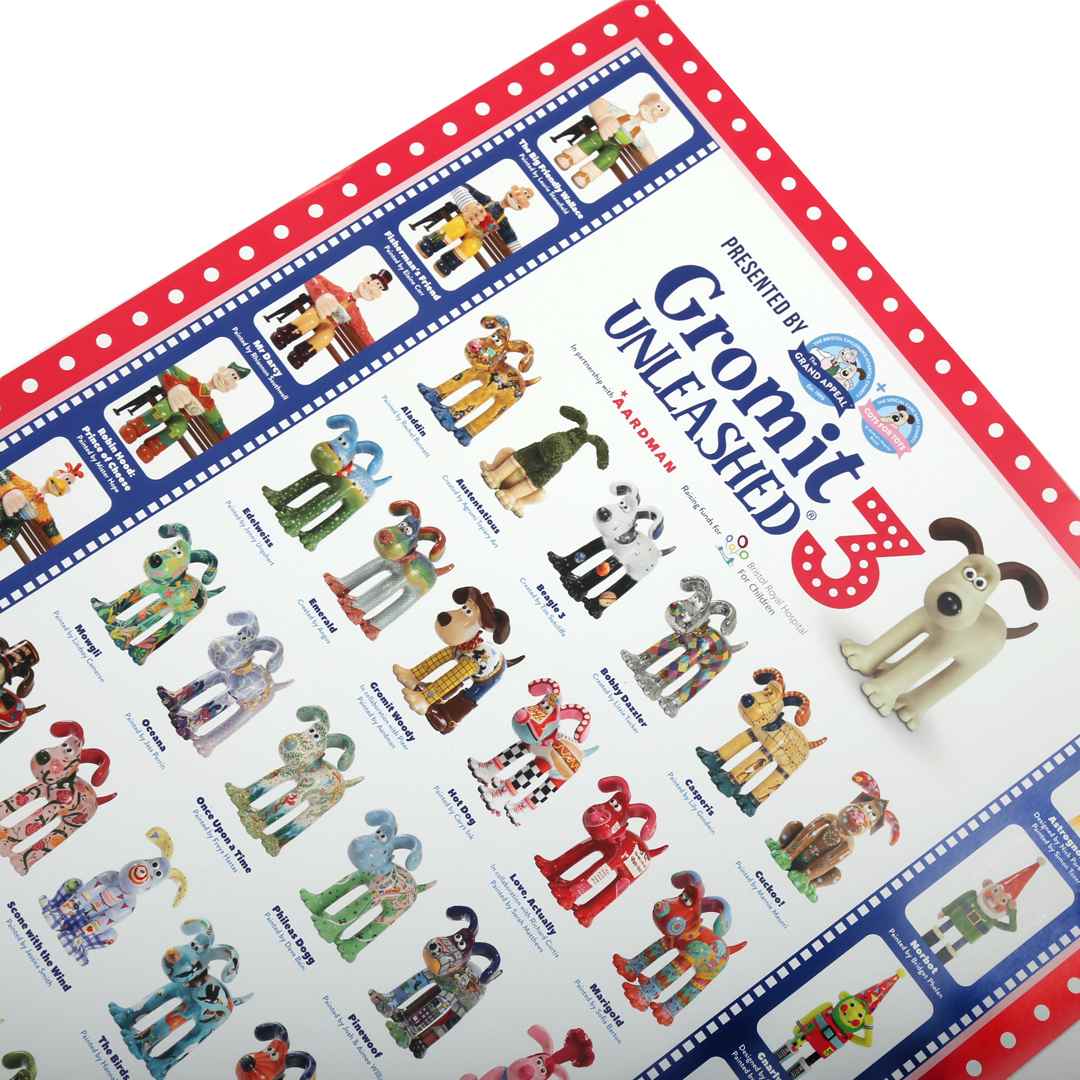 Collect all the stars of the show in one star-studded print, see your favourite designs and maybe the ones you missed. This high-quality printed poster is the ultimate piece of merchandise and a must-have for all Gromit Unleashed fans.